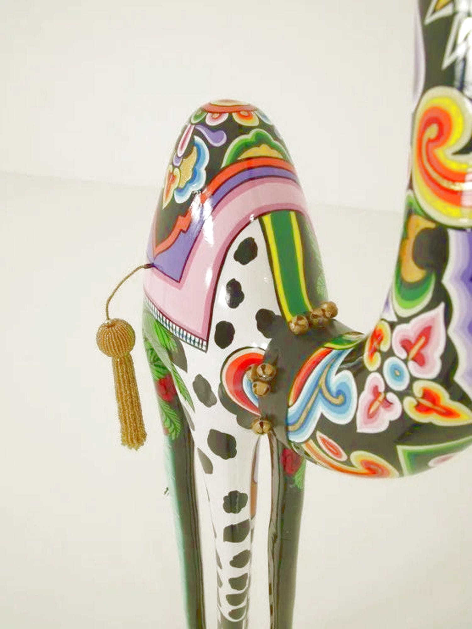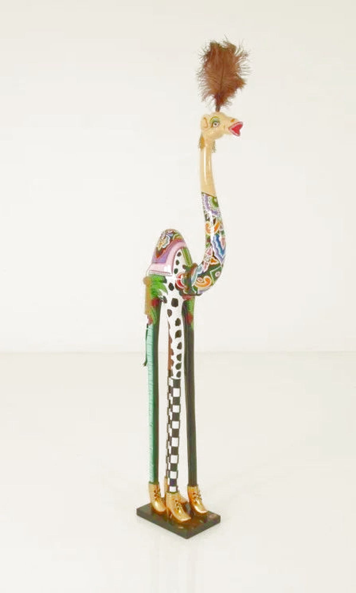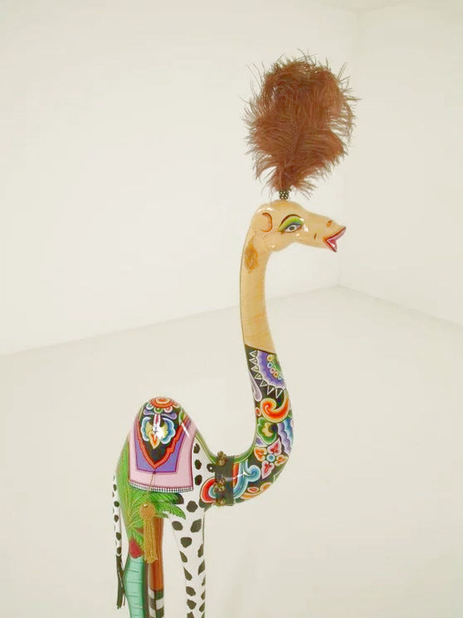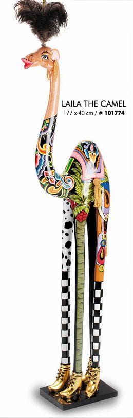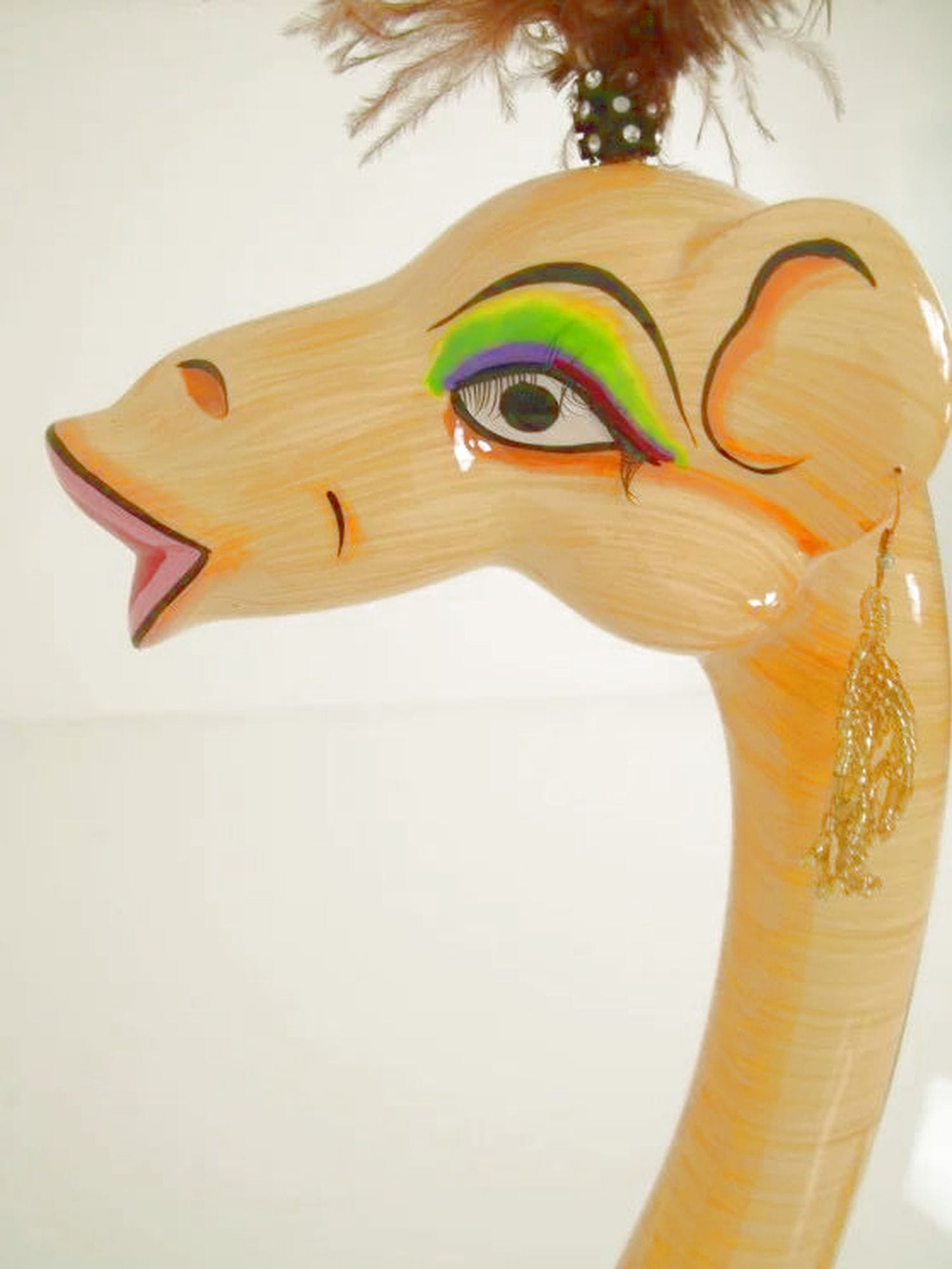 Details: DRAG Kamel LAILA zegit mit schlanken langen Bein und einer Affinität zum weiblichen "Herausputzen" einen bleibenden Eindruck. Mit langen Wimpern, Ohrringen und dem besonders feinem Federkopfschmuck, schmilzt jeder Anbeter beim Anblick dieser vollen Kusslippen einfach nur dahin .. besonders auch bei der eindrucksvollen Bemalung und den liebenswert goldenen HighHeels. Die grazile und wohlgeformte Figur des DRAG Kamels LAILA zeigt sofort: hier wird viel Wert auf den besonders effektvollen Auftritt gelegt.